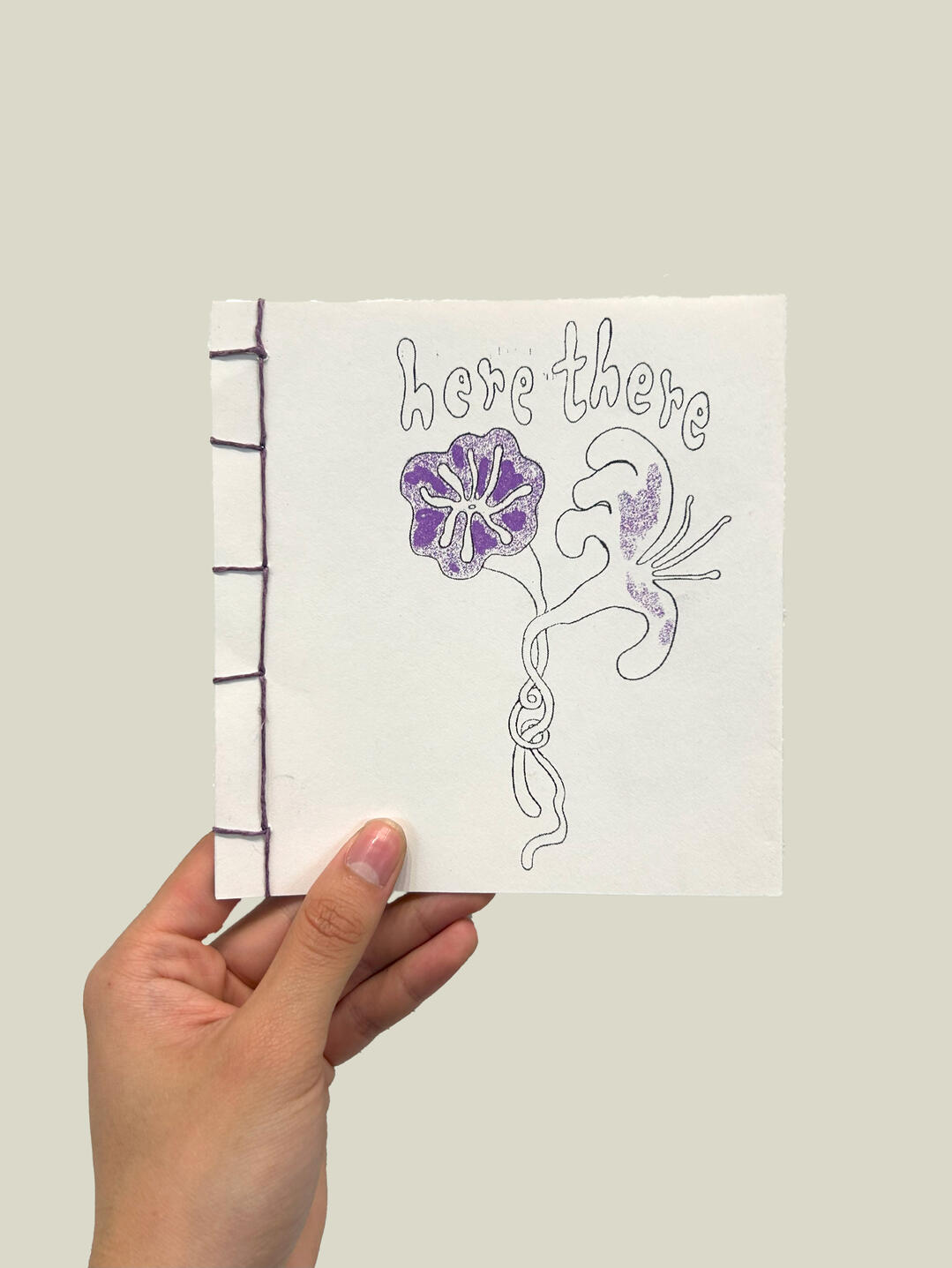 a three color screen print on 5 different kinds of paper, layered and french folded, then hand stitched with waxed purple thread